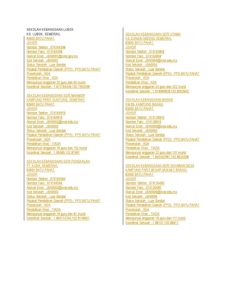 Zon Kod Namas Alamat1 Batu Pahat Br01 Sekolah Agama Bandar Batu Pahat Batu Pahat Br02 Sekolah Agama Setia Jaya Pt Hj Ali Batu Pahat Br03 Sekolah